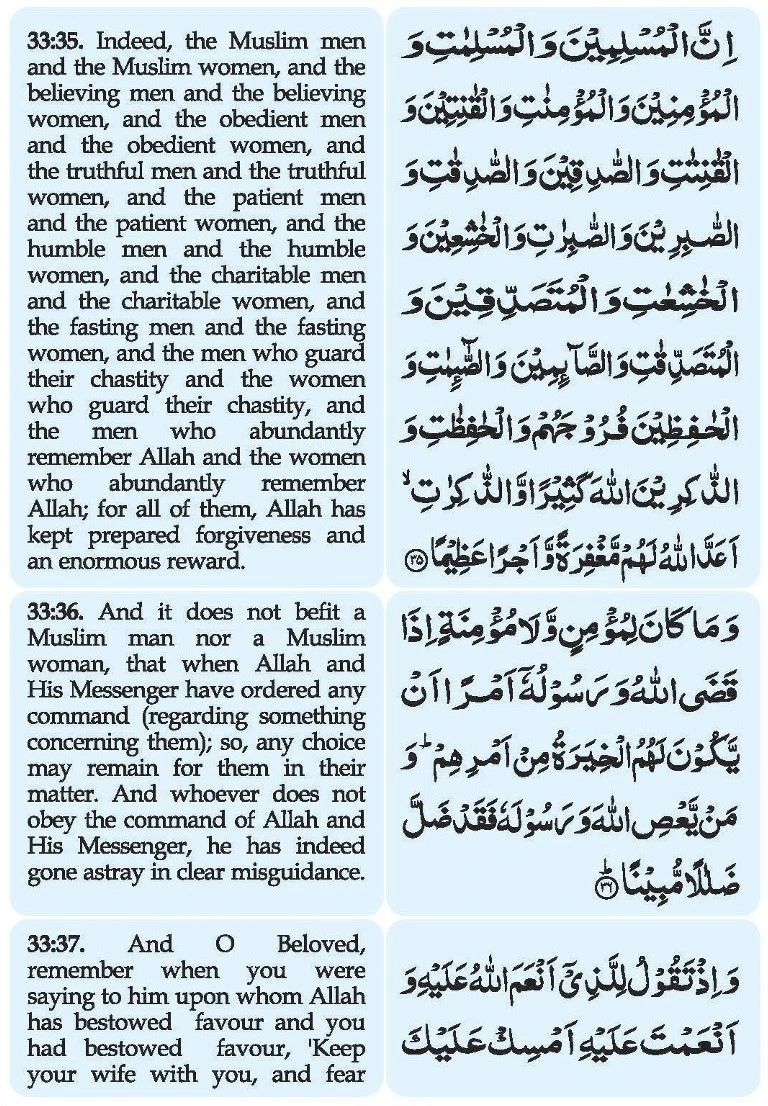 35. Innal Muslimeena Wal Muslimaati Wal Mu’mineena Wal Mu’minaati Walqaaniteena Walqaanitaati Wassaadiqeena Wassaadiqaati Wassaabireena Wassaabiraati Walkhaashi’eena Walkhaashi’aati Walmutasaddiqeena Walmutasaddiqaati Wassaaa’imeena Wassaaa’imaati Walhaafizeena Furoojahum Walhaafizaati Waz Zaakireenal Laaha Kaseeranw Waz Zaakiraati A’addal Laahu Lahum Maghfiratanw Wa Ajran ‘Azeemaa