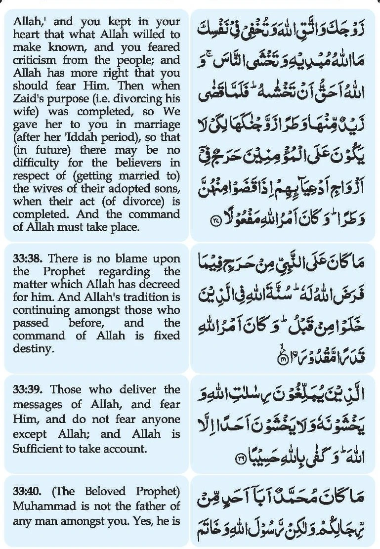 37. Wa Iz Taqoolu Lillazeee An’amal Laahu ‘Alaihi Wa An’amta ‘Alaihi Amsik ‘Alaika Zawjaka Wattaqil Laaha Wa Tukhfee Fee Nafsika Mal Laahu Mubdeehi Wa Takhshan Naasa Wallaahu Ahaqqu An Takhshaah; Falammaa Qadaa Zaidum Minhaa Wataran Zawwajnaa Kahaa Likay Laa Yakoona ‘Alal Mu’mineena Harajun Feee Azwaaji Ad’iyaaa’ihim Izaa Qadaw Minhunna Wataraa; Wa Kaana Amrul Laahi Maf’oolaa