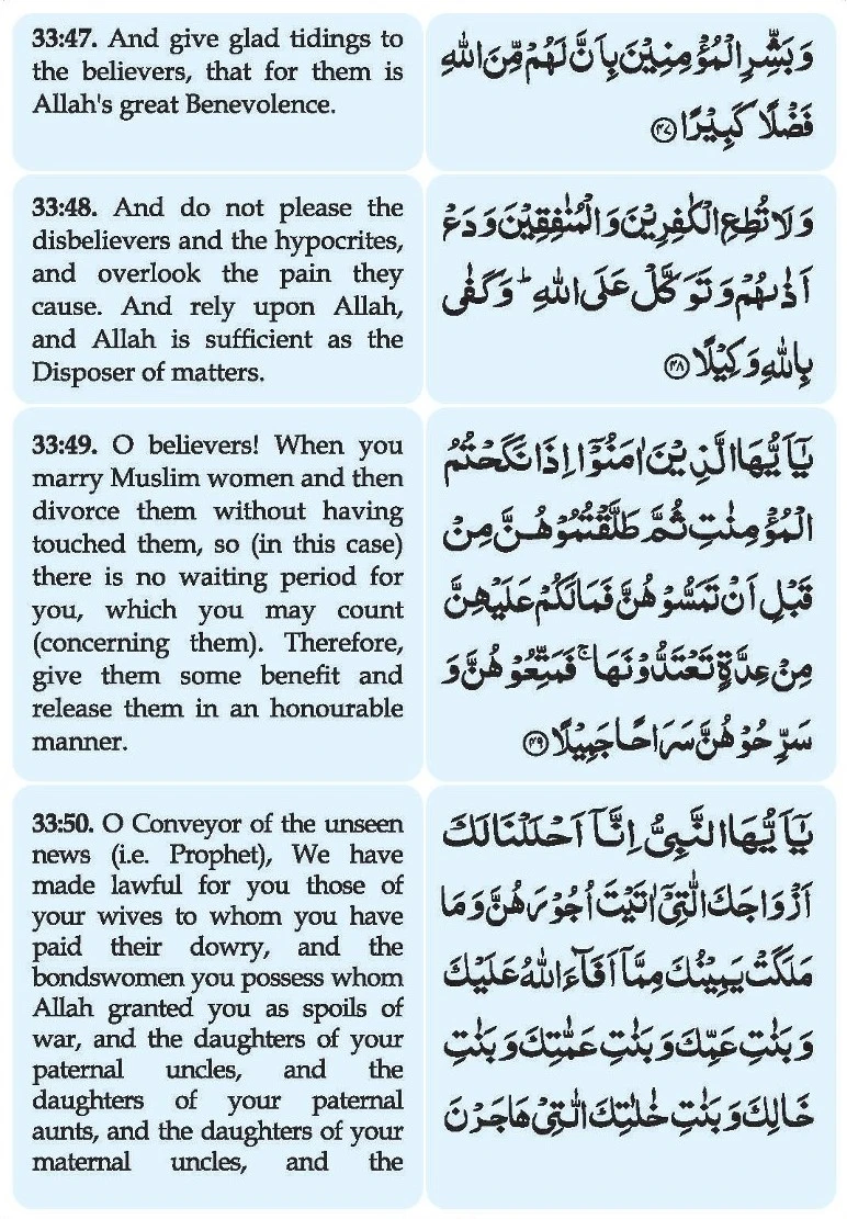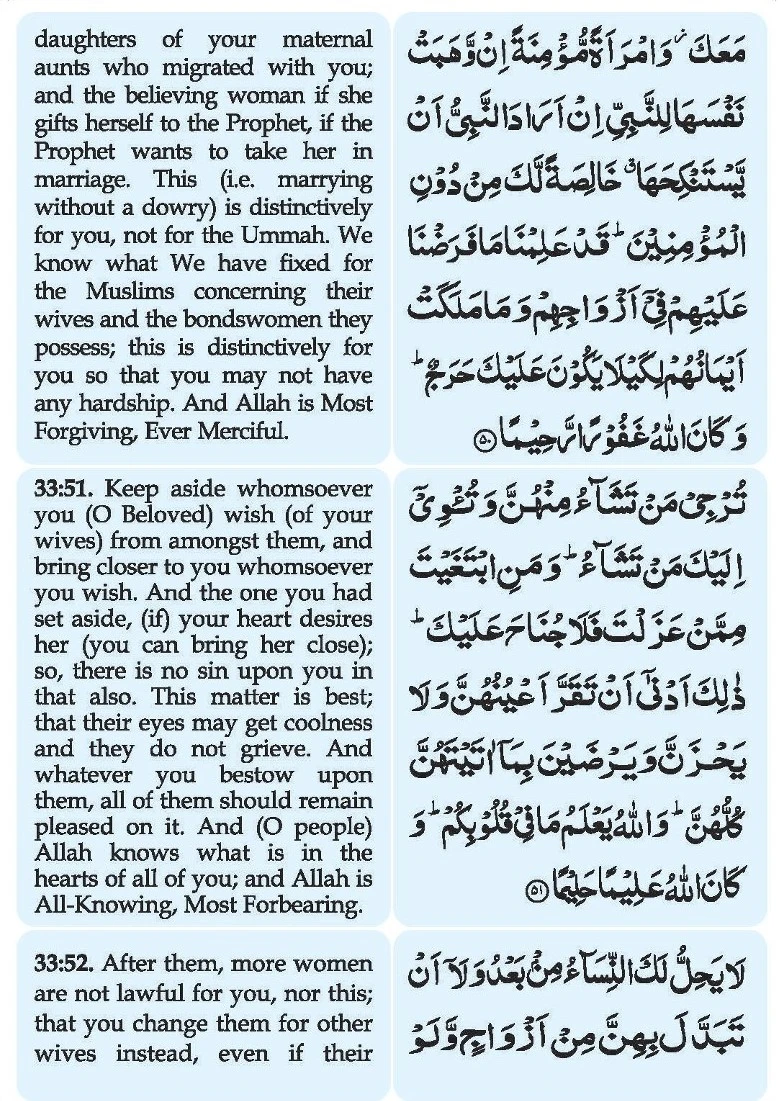 50. Yaaa Aiyuhan Nabiyyu Innaaa Ahlalnaa Laka Azwaa Jakal Laatee Aataiyta Ujoora Hunna Wa Maa Malakat Yameenuka Mimmaaa Afaaa’al Laahu ‘Alaika Wa Banaati ‘Ammika Wa Banaati ‘Ammaatika Wa Banaati Khaalika Wa Banaati Khaalaa Tikal Laatee Haajarna Ma’aka Wamra’ Atan Mu’minatan Inw Wahabat Nafsahaa Lin Nabiyyi In Araadan Nabiyyu Ai Yastan Kihahaa Khaalisatan Laka Min Doonil Mu’mineen; Qad ‘Alimnaa Maa Faradnaa ‘Alaihim Feee Azwaajihim Wa Maa Malakat Aimaanuhum Li Kailaa Yakoona ‘Alaika Haraj; Wa Kaanal Laahu Ghafoorar Raheema
