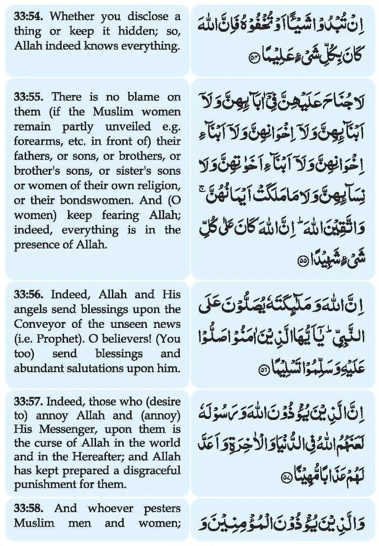 55. Laa Junaaha ‘Alaihinna Feee Aabaaa’ihinna Wa Laaa Abnaaa’ihinna Wa Laaa Ikhwaanihinnna Wa Laaa Abnaaa’i Ikhwaanihinna Wa Laaa Abnaaa’i Akhawaatihinna Wa Laa Nisaaa’i Hinna Wa Laa Maa Malakat Aimaanuhunn; Wattaqeenal Laah; Innal Laaha Kaana ‘Alaa Kulli Shai’in Shaheedaa