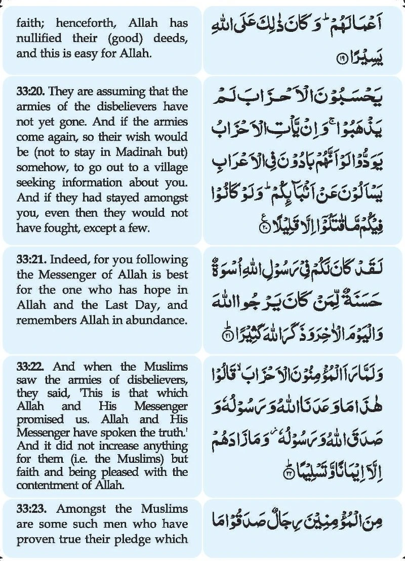 21. Laqad Kaana Lakum Fee Rasoolil Laahi Uswatun Hasanatul Liman Kaana Yarjul Laaha Wal Yawmal Aakhira Wa Zakaral Laaha Kaseeraa