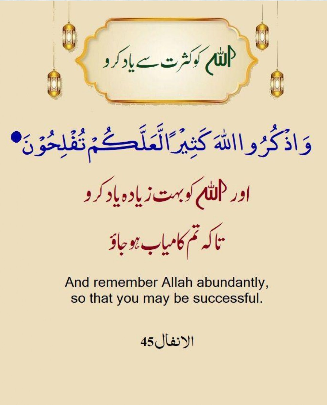 45. Yaaa Aiyuhal Lazeena Aamanooo Izaa Laqeetum Fi’atan Fasbutoo Wazkurul Laaha Kaseeral La’allakum Tuflihoon