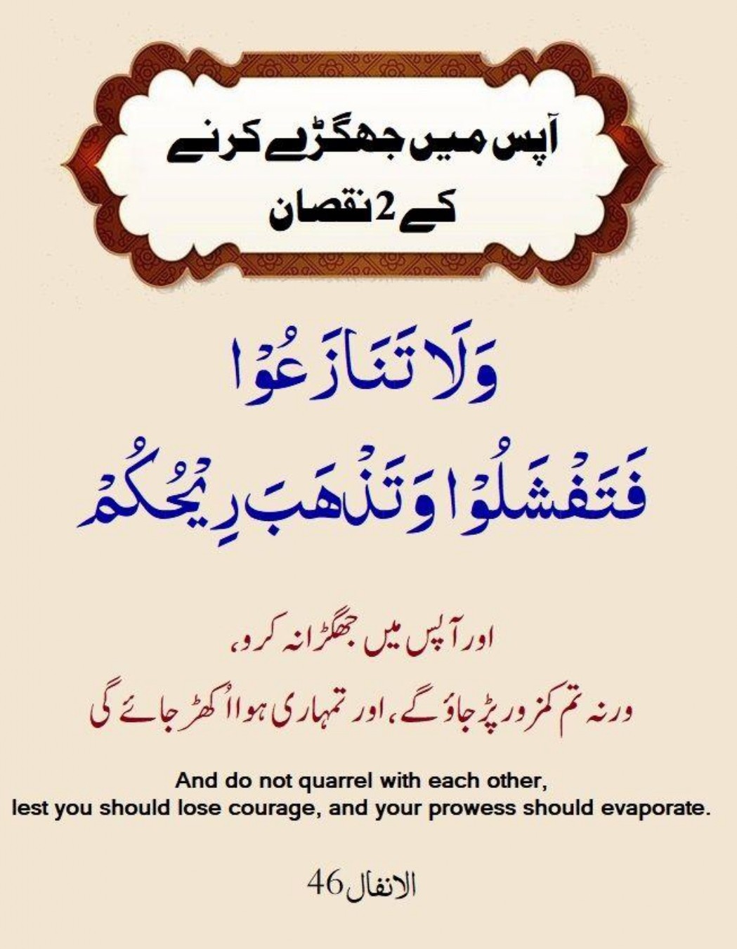 46. Wa Atee’ul Laaha Wa Rasoolahoo Wa Laa Tanaaza’oo Fatafshaloo Wa Tazhaba Reehukum Wasbiroo; Innal Laaha Ma’as Saabireen