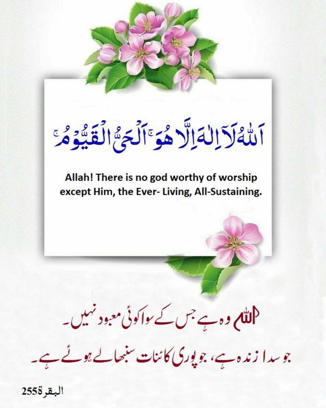 2:255. Allah is (worthy of worship); there is no one worthy of worship except Him. He is Alive on His own accord and the Preserver of (all) others. Neither drowsiness nor sleep overcomes Him. Whatever is in the heavens and whatever is in the earth belongs to Him alone. Who is the one who can intercede in His Domain without His permission? He knows whatever is in front of them and whatever is behind them; and they (i.e. people) do not attain from His knowledge except as much as He wills. The heavens and the earth are encompassed in His Throne and their protection is not a burden for Him. And only He is the Supreme, the Great.
