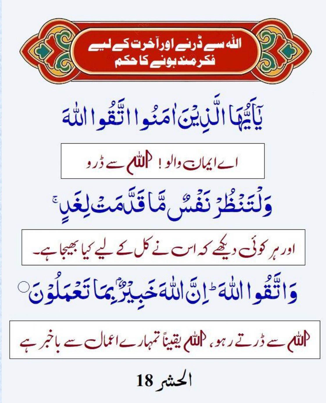 18. Yaaa Ayyuhal Lazeena Aamanut Taqul-Laaha; Waltanzur Nafsum Maa Qaddamat Lighadiw Wattaqul Laah; Innal Laaha Khabeerum Bimaa Ta’maloon