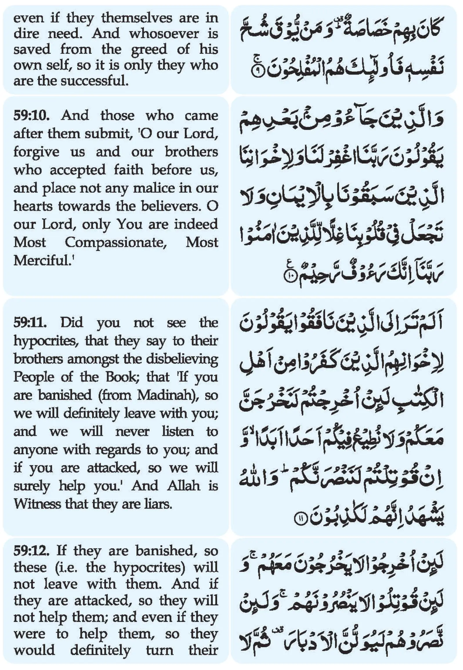 11. Alam Tara Ilal Lazeena Naafaqoo Yaqooloona Li Ikhwaanihimul Lazeena Kafaroo Min Ahlil Kitaabi La’in Ukhrijtum Lanakhrujanna Ma’akum Wa Laa Nutee’u Feekum Ahadan Abadanw-Wa In Qootiltum Lanansuran Nakum Wallaahu Yashhadu Innahum Lakaaziboon