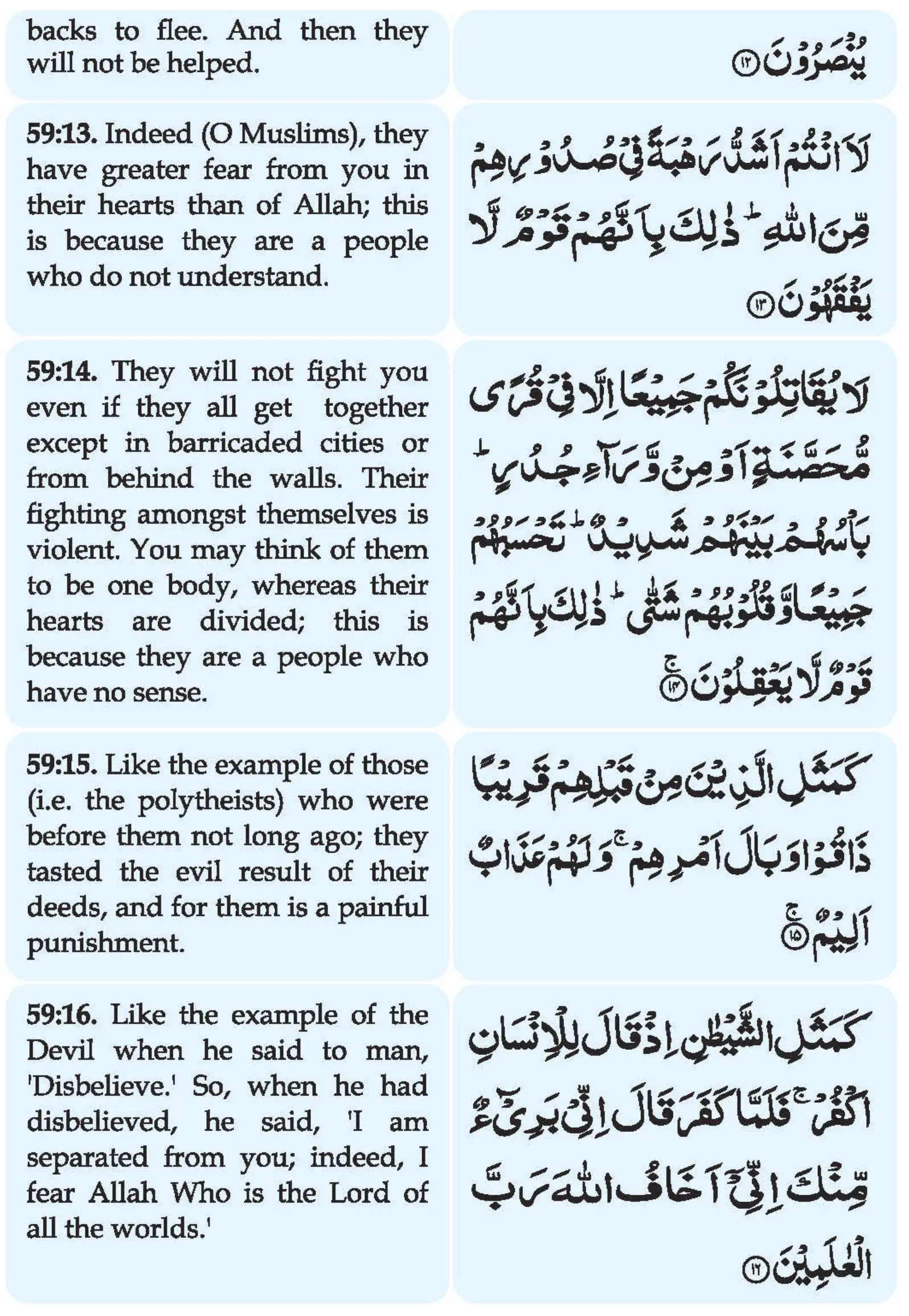 14. Laa Yuqaatiloonakum Jamee’an Illaa Fee Quram Muhas Sanatin Aw Minw Waraaa’i Judur; Baasuhum Bainahum Shadeed; Tahsabuhum Jamee’anw-Wa Quloobuhum Shatta; Zaalika Biannahum Qawmul Laa Ya’qiloon