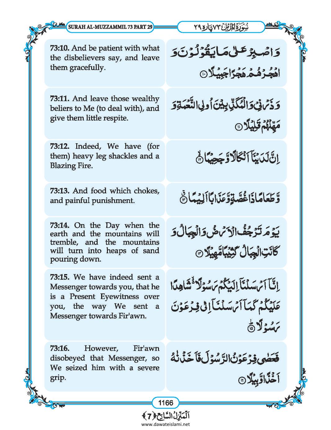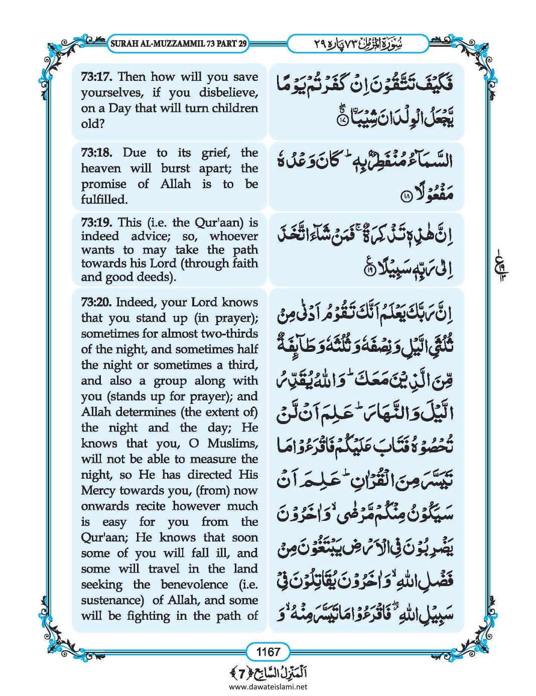 20. Inna Rabbaka Ya’lamu Annaka Taqoomu Adnaa Min Sulusa Yil Laili Wa Nisfahoo Wa Sulusahoo Wa Taaa’ifatum Minal Lazeena Ma’ak; Wal Laahu Yuqaddirul Laila Wanna Haar; ‘Alima Al Lan Tuhsoohu Fataaba ‘Alaikum Faqra’oo Maa Tayassara Minal Quraan; ‘Alima An Sa Yakoonu Minkum Mardaa Wa Aakharoona Yadriboona Fil Ardi Yabtaghoona Min Fadlil Laahi Wa Aakharoona Yuqaatiloona Fee Sabeelil Laahi Faqra’oo Ma Tayassara Minhu Wa Aqeemus Salaata Wa Aatuz Zakaata Wa Aqridul Laaha Qardan Hasanaa; Wa Maa Tuqaddimoo Li Anfusikum Min Khairin Tajidoohu ‘Indal Laahi Huwa Khayranw Wa A’zama Ajraa; Wastaghfirul Laahaa Innal Laaha Ghafoorur Raheem.