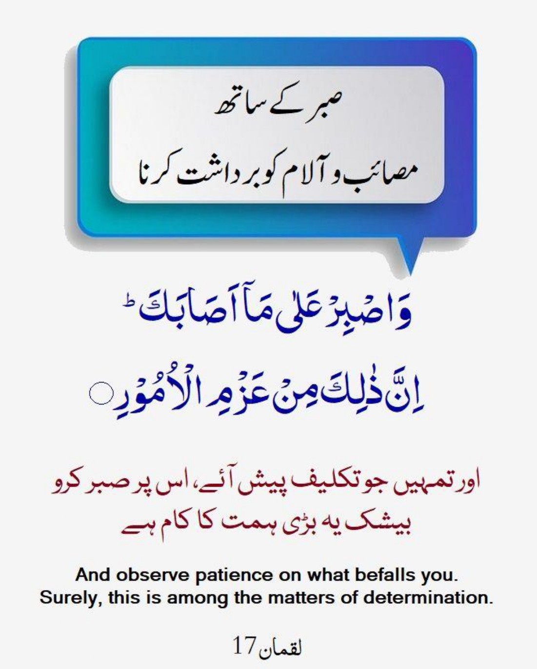 17. Yaa Bunaiya Aqimis-Salaata Waamur Bilma’roofi Wanha ‘Anil Munkari Wasbir ‘Alaa Maaa Asaabaka Inna Zaalika Min ‘Azmil Umoor