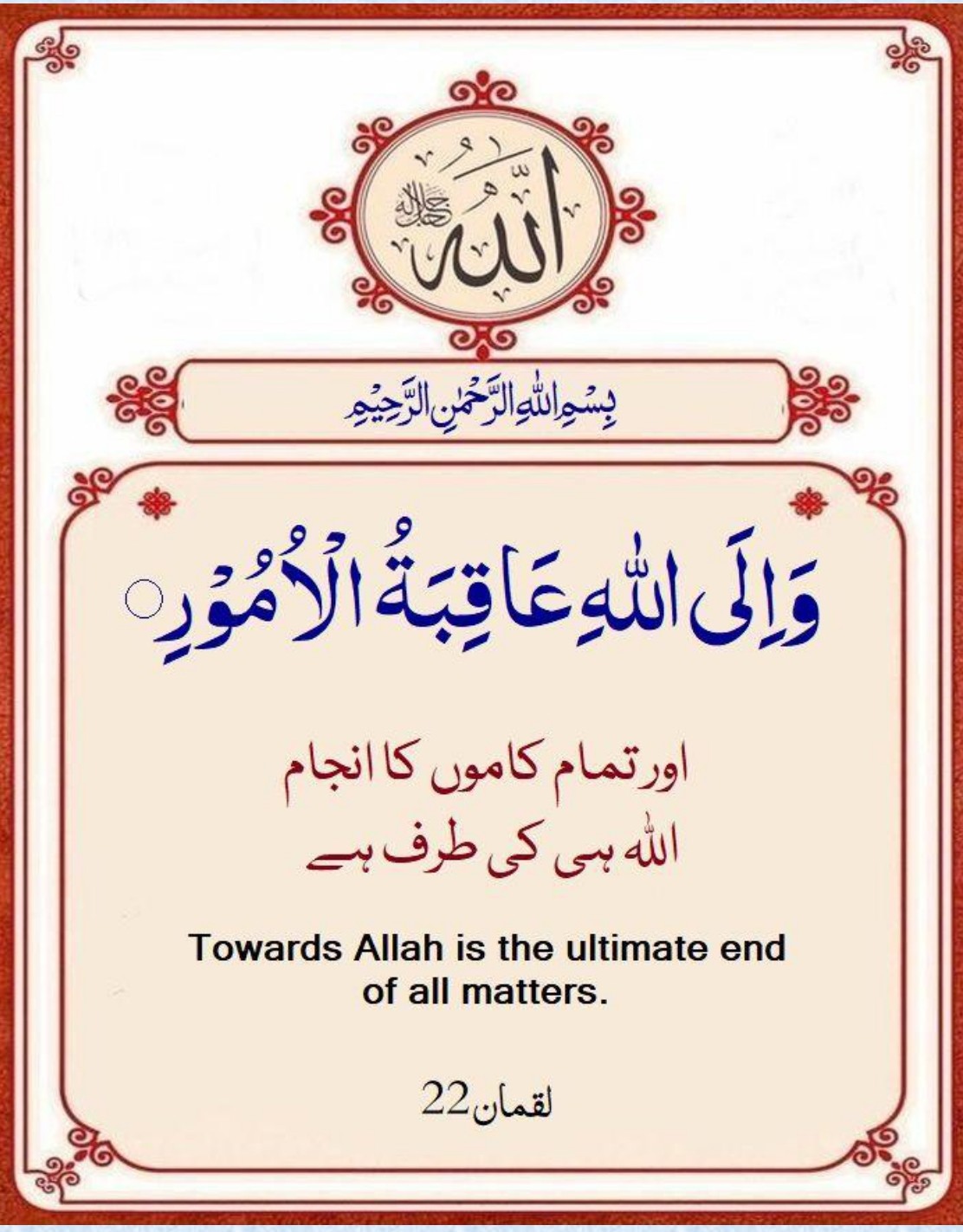 22. Wa Many Yuslim Wajha Hooo Ilal Laahi Wa Huwa Muhsinun Faqadistamsaka Bil’ur Watil Wusqaa; Wa Ilal Laahi ‘Aaqibatul Umoor