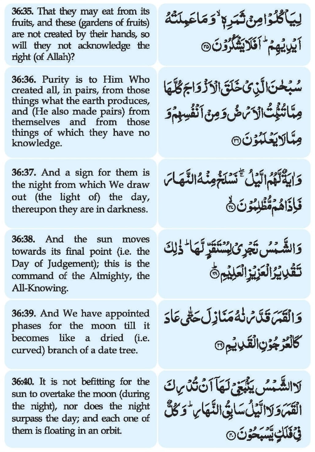 36:40. It is not befitting for the sun to overtake the moon (during the night), nor does the night surpass the day; and each one of them is floating in an orbit.