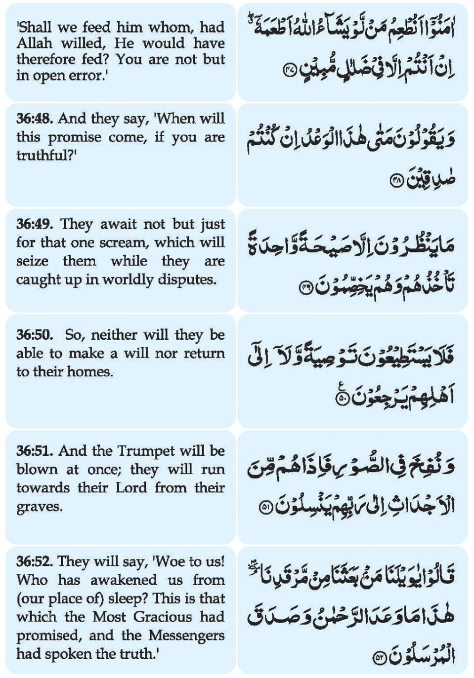 36:52. They will say, ‘Woe to us! Who has awakened us from (our place of) sleep? This is that which the Most Gracious had promised, and the Messengers had spoken the truth.’